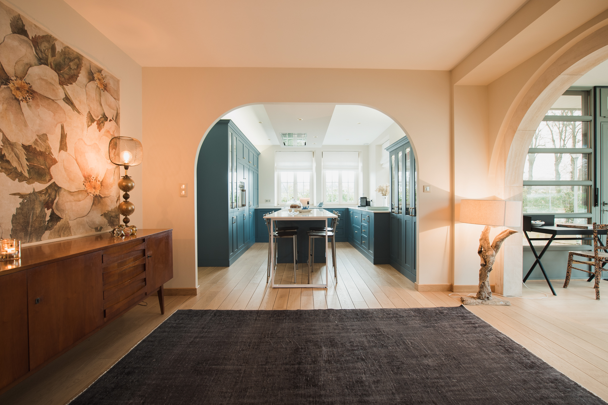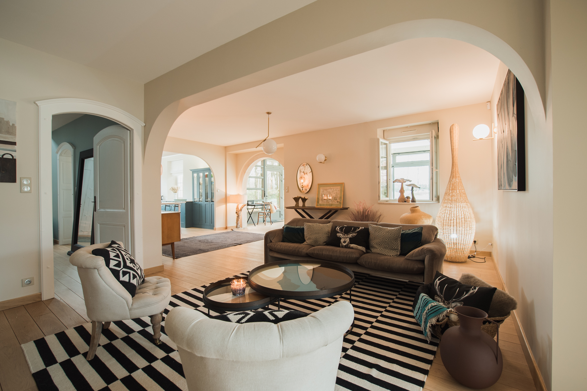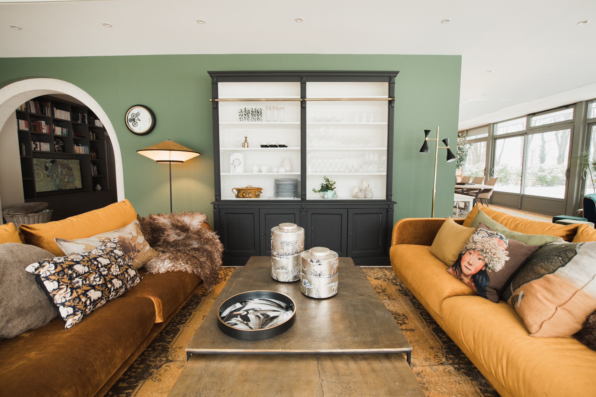 Un parquet en chêne massif a été posé sur l’ensemble du rez-de-chaussée, ainsi qu’une cheminée centrale. La bibliothèque se prolonge d’une pièce à l’autre faisant le lien avec ce nouvel espace.